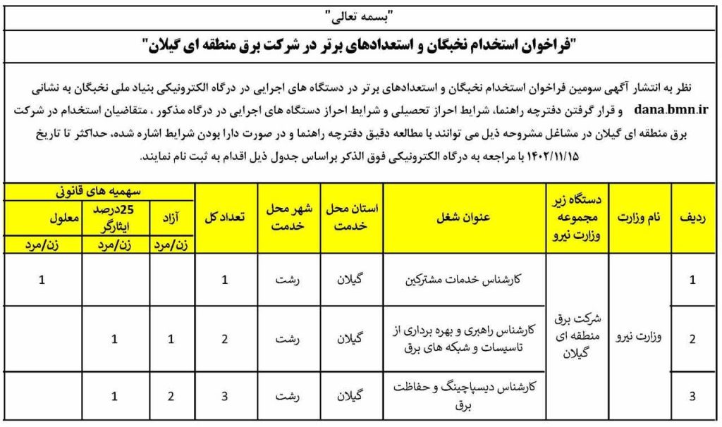 در خصوص انتشار آگهی سومین فراخوان جذب نخبگان و استعدادهای برتر دستگاه های اجرایی در درگاه الکترونیکی بنیاد ملی نخبگان به نشانی dana.bmn.ir و قرار دادن دفترچه راهنما، الزامات آموزشی و الزامات دستگاه های اجرایی در پورتال مذکور، متقاضیان استخدام در شرکت برق منطقه ای گیلان در مشاغلی که در ادامه آمده است می توانند دفترچه راهنما را به دقت مطالعه و در صورت داشتن شرایط ذکر شده حداکثر تا زمان مقرر. از تاریخ زیر: