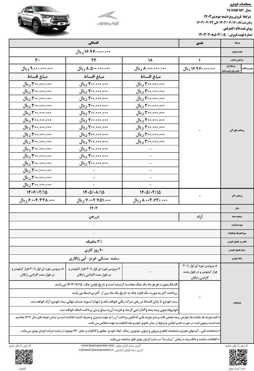 شرایط فروش این سه خودرو از ۱۶ تا ۲۴ تیر برقرار است و متقاضیان می توانند تا تکمیل ظرفیت برای خرید KMC T8، جک S3 و جک J4 به نمایندگان این شرکت مراجعه کنند. در این طرح فروش مهلت تحویل خودرو ۹۰ روز کاری می باشد. البته KMC T8 با موعد تحویل ۶۰ روز کاری به فروش می رسد. همچنین متقاضیان می توانند این سه خودروی کرمان موتور را با اقساط تا ۳۰ ماه خریداری کنند. سود تاخیر در تحویل ۳ درصد به صورت ماهانه است.
