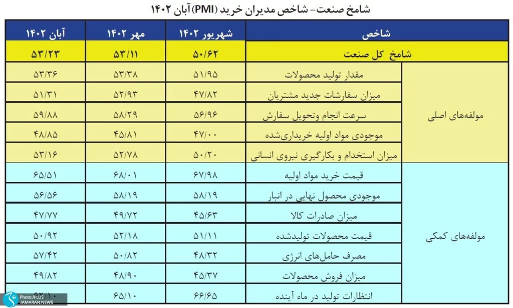 آخرین نظرسنجی انجام شده نشان می دهد که شاخص ترکیبی مدیران خرید برای کل اقتصاد ایران در آبان عدد ۵۰.۹۶ برای ماه گزارش شده است که نسبت به مهرماه ۵۴.۱۵ کاهش داشته است. در میان مولفه های اصلی شاخص، میزان سفارش های جدید مشتریان نسبت به سایر مولفه ها کاهش شدیدتری داشته است. در آبان در ماه، کسب و کارها تقاضای ضعیف تری را از بازارهای داخلی گزارش کردند. شاخص میزان سفارشات جدید مشتریان با رقم ۴۶.۸۹ کمترین ارزش سه ماه اخیر را به ثبت رسانده است.