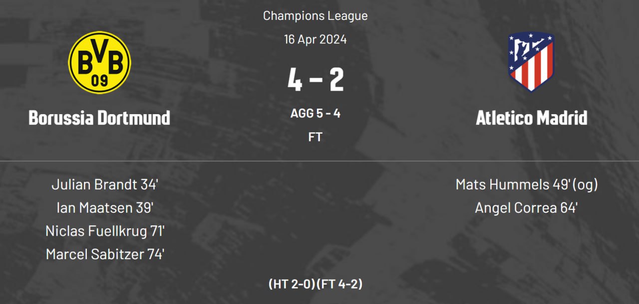 * دورتموند ۴ – اتلتیکو مادرید ۲ (مجموع ۵:۴ به سود دورتموند)