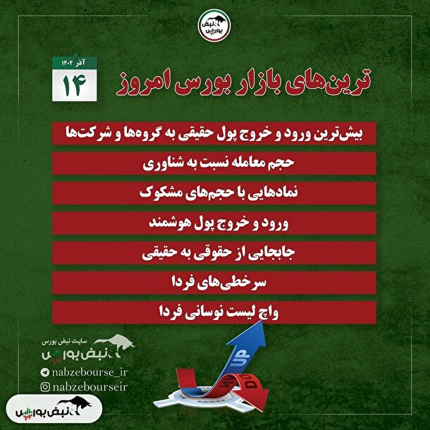 چیزی را گزارش کنید نبض بازار سهامدر این مقاله به مهم ترین موارد در بورس امروز سه شنبه چهاردهم می پردازیم آذر عدد ۱۴۰۲ را می گذاریم. کدام علامت ها حجم مشکوکی دارند؟