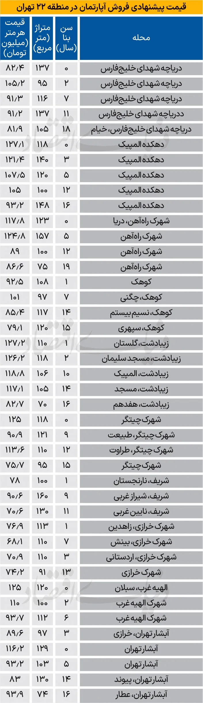 قیمت آپارتمان در منطقه 22 تهران + جدول