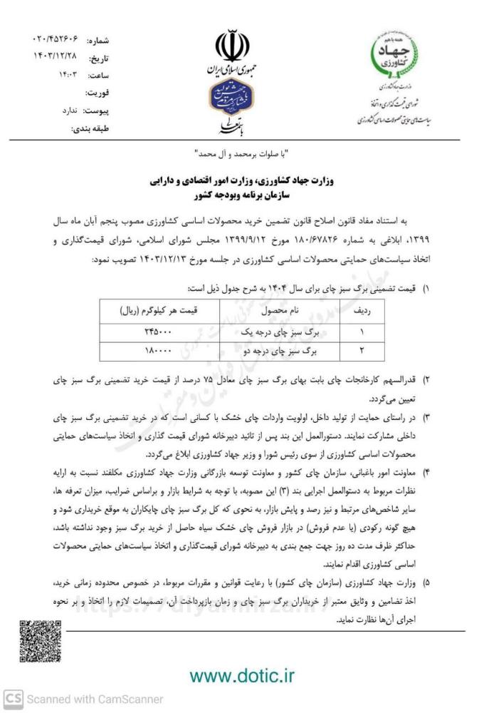 براساس بانک اطلاعاتی اطلاعات Diarmirza ، شورای قیمت گذاری سیاست های محصولات کشاورزی را در مورد تعیین قیمت تضمین شده چای سبز برای سال ۲ ، مورخ ۱/۴/۱۱ توسط وزیر امور خارجه جهاد و رئیس شورای قیمت گذاری و سیاست محصول تصویب و تصویب کرده است.