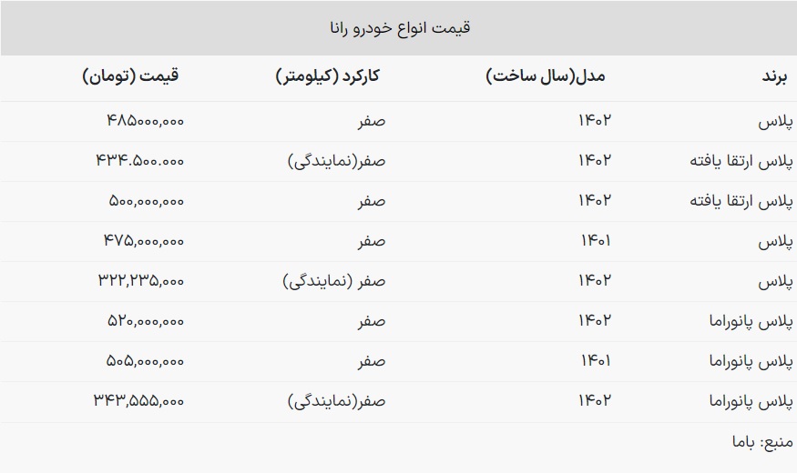 بر اساس قیمت کارخانه محصولات ایران خودرو در آبان رانا پلاس ارتقا یافته ماهانه ۴۳۴ میلیون تومان، قیمت رانا پلاس در نمایندگی ۳۲۲ میلیون تومان و ایران خودرو قیمت فروش رانا پلاس پانوراما را ۳۴۳ میلیون تومان تعیین کرده است.