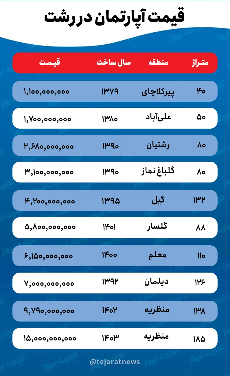 یک تبلیغ دیگر به یک واحد دو نفره تبدیل شد ، یک ساختار یک ساله از منطقه Golsar در نزدیکی بلوار Golsar ، ۵ میلیارد دلار و ۵ میلیون. علاوه بر این ، یک واحد ۳ متری با سه شرط با یک سال از سال ساخت در منطقه دیلمن برای هفت میلیارد تومانس تبلیغ شد.