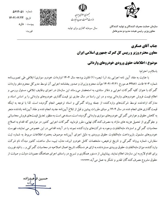 این نامه می افزاید: با توجه به این واقعیت که قیمت گذاری در سال ۲ ، قیمت گذاری براساس آیین نامه های قبلی انجام شده است و قبل از اساسنامه جدید و مقررات اساسنامه فوق منجر به کاهش حقوق و وظایف اتومبیل های مسافربری وارداتی شده است ، از وی خواسته می شود قیمت فروش را تطبیق داده و از هزینه های مصرف کننده جلوگیری کند. در شرکت یا در آینده ، لیست وسایل نقلیه به دلیل اجرای مقررات و همچنین شماره ثبت سفارش ، مجوز گمرک و تاریخ ، مشخصات کامل وسیله نقلیه (برند ، مدل ، نوع ، سال ساخت و ساز ، کشور مبدا ، کشور مبدا ، نام شرکت های وارد شده ، نام شرکت ، سازمان ، سازمان ، سازمان ، سازمان ، سازمان ، سازمان ، سازمان ، اختلاف بین حقوق ورودی را نشان می دهد.
