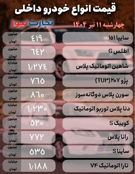 قیمت خودرو امروز 11 تیر 1404 / افزایش قیمت کارخانه مانع از ریزش قیمت خودروها در بازار آزاد شد! + جدول