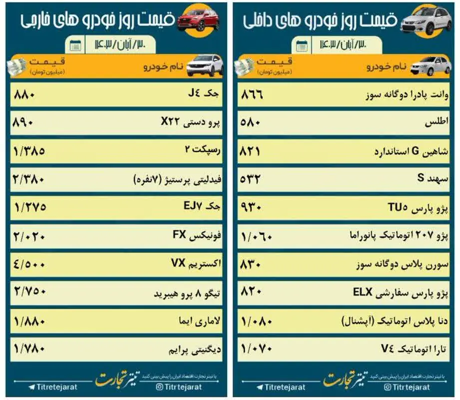 قیمت ماشین امروز ۳۰ آبان ۱۴۰۳ اعلام شد. پس از کسب مجوز افزایش قیمت محصولات کارخانه ایران خودرو و سایپا، وضعیت بازار خودرو در آستانه جهش عظیمی است و به موازات آن خبر می رسد که محصولات مونتاژی نیز در حال افزایش هستند.