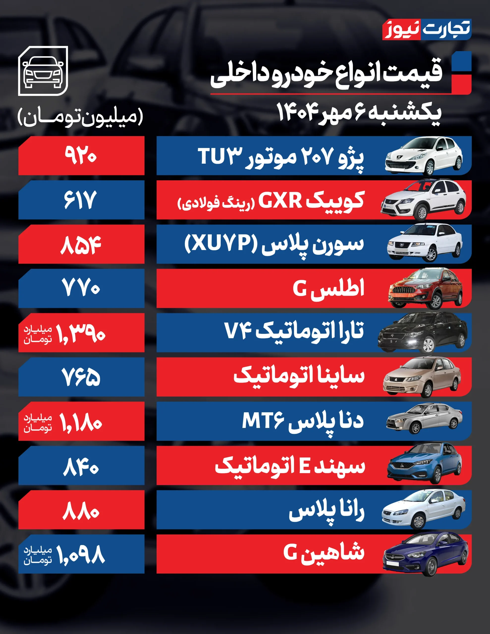 قیمت ماشین امروز ۶ مهر در سال ۱۴۰۴ ، شرکت های بازرگانی اعلام شد.
