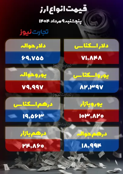 اسکناس دلار در مرکز مبادله این پنجشنبه ، ۹ ، ۹. مرداد با ۷۱،۸۴۸ دلار معامله شد. انتقال دلار نیز با قیمت ۶۹،۷۷۵ دلار بود.