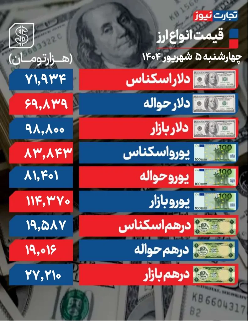 قیمت دلار امروز چهارشنبه 5 شهریور 1404 / جهش 2 هزار و 600 تومانی، دلار را در سقف کانال 98 هزار تومان نشاند