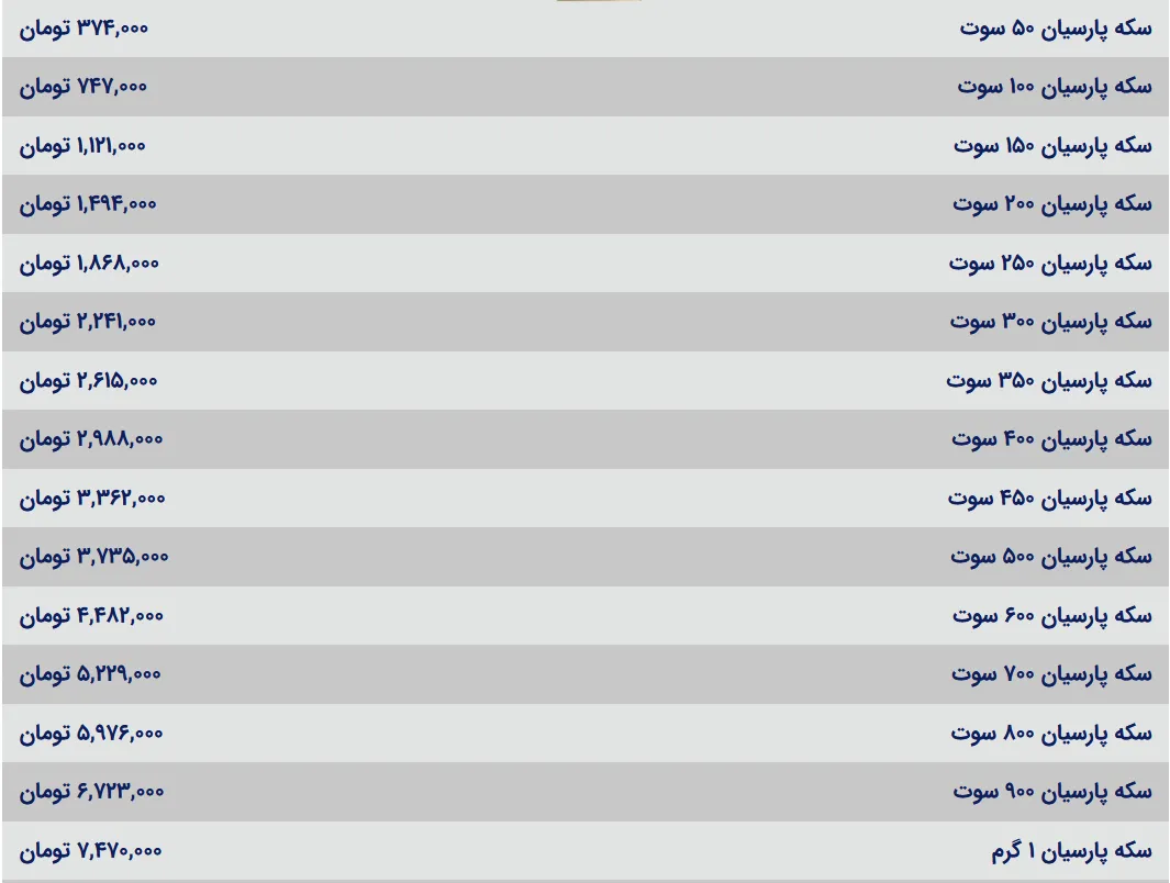 قیمت سکه پارسیان امروز دوشنبه ۲۰ مرداد ۱۴۰۴