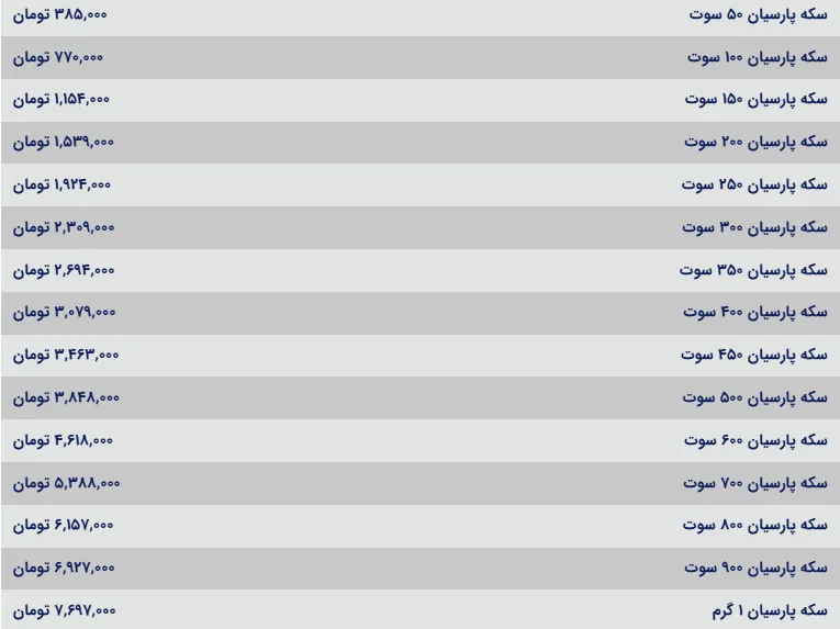 قیمت سکه پارسیان امروز شنبه ۱ شهریور ۱۴۰۴