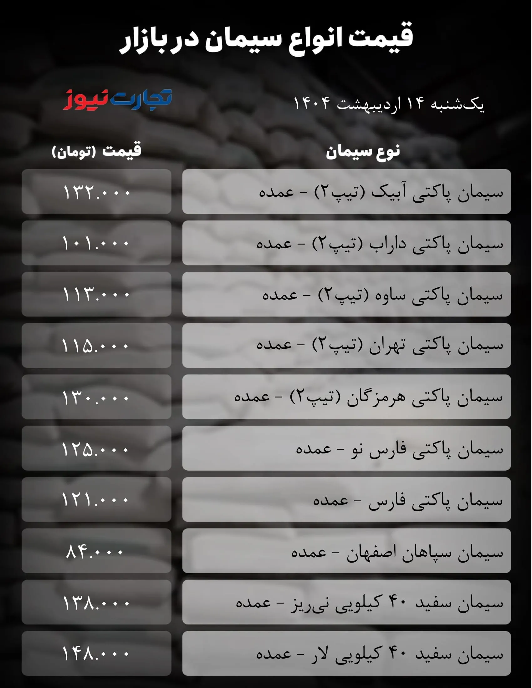 طبق اخبار تجاری ، قیمت سیمان امروز ۱۴ است اردیبهشت ۲۰۱۴ شرایط بازار تغییر نکرده و همان محدودیت ها هنوز در بازار است. کارشناسان و فعالان کت معتقدند که این ثبات به عنوان یک تفرجگاه و احتیاط توسط تولید کنندگان در نظر گرفته می شود ، اما افزایش قیمت و هزینه محصولات همچنان سایه دار است و به نظر می رسد با افزایش محدودیت ها و تولید کارخانه ، افزایش قیمت را تسریع می کند.