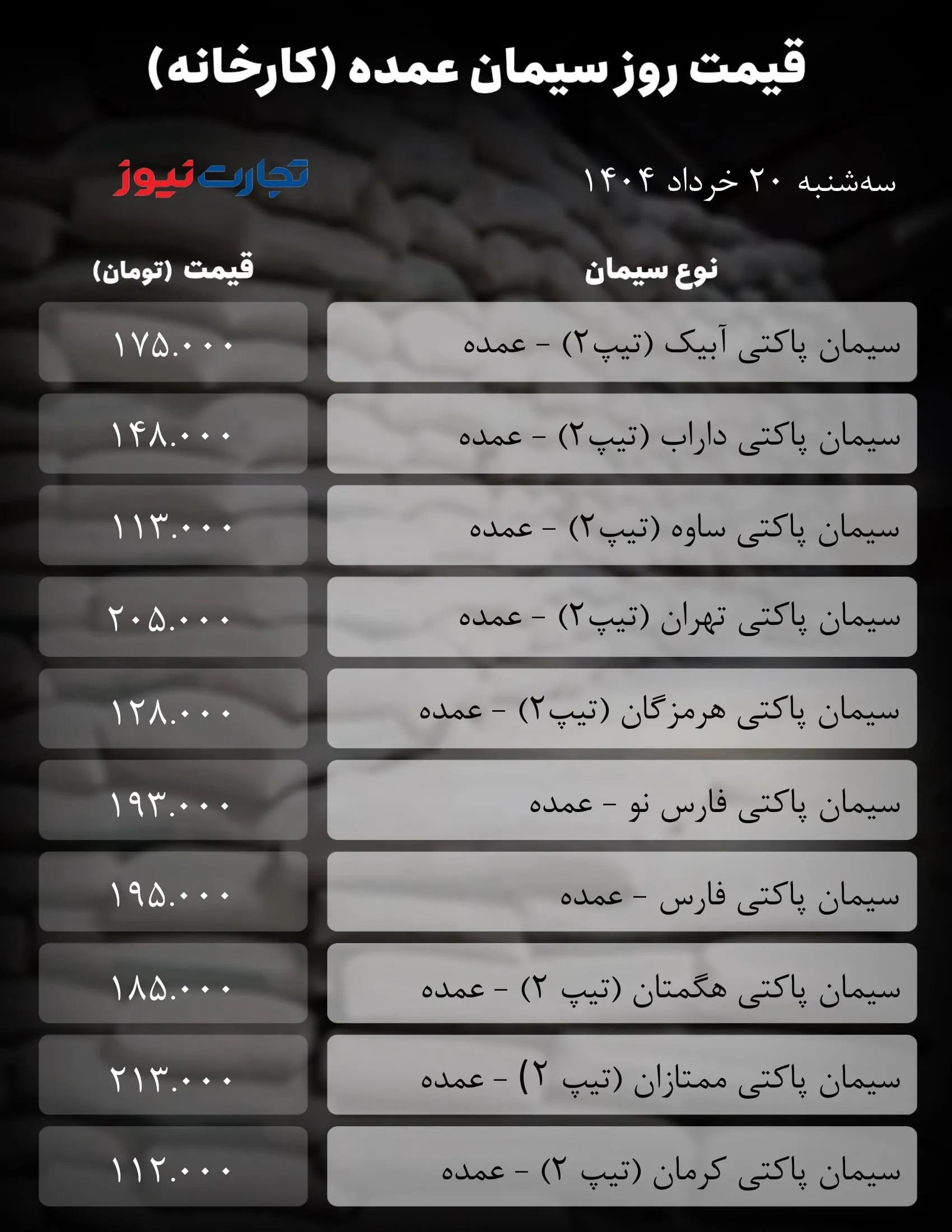 طبق اخبار تجاری ، قیمت سیمان بزرگ امروز ۲۰ است خرداد اعلام شد بازار سیمان این هفته نشان داده است که تمام تلاش خود را برای افزایش قیمت ها انجام داده است. به دلیل عدم وجود محرک های قوی و کاهش نسبی تقاضا ، این تلاش ها اکنون به ثبات پایان یافته است.