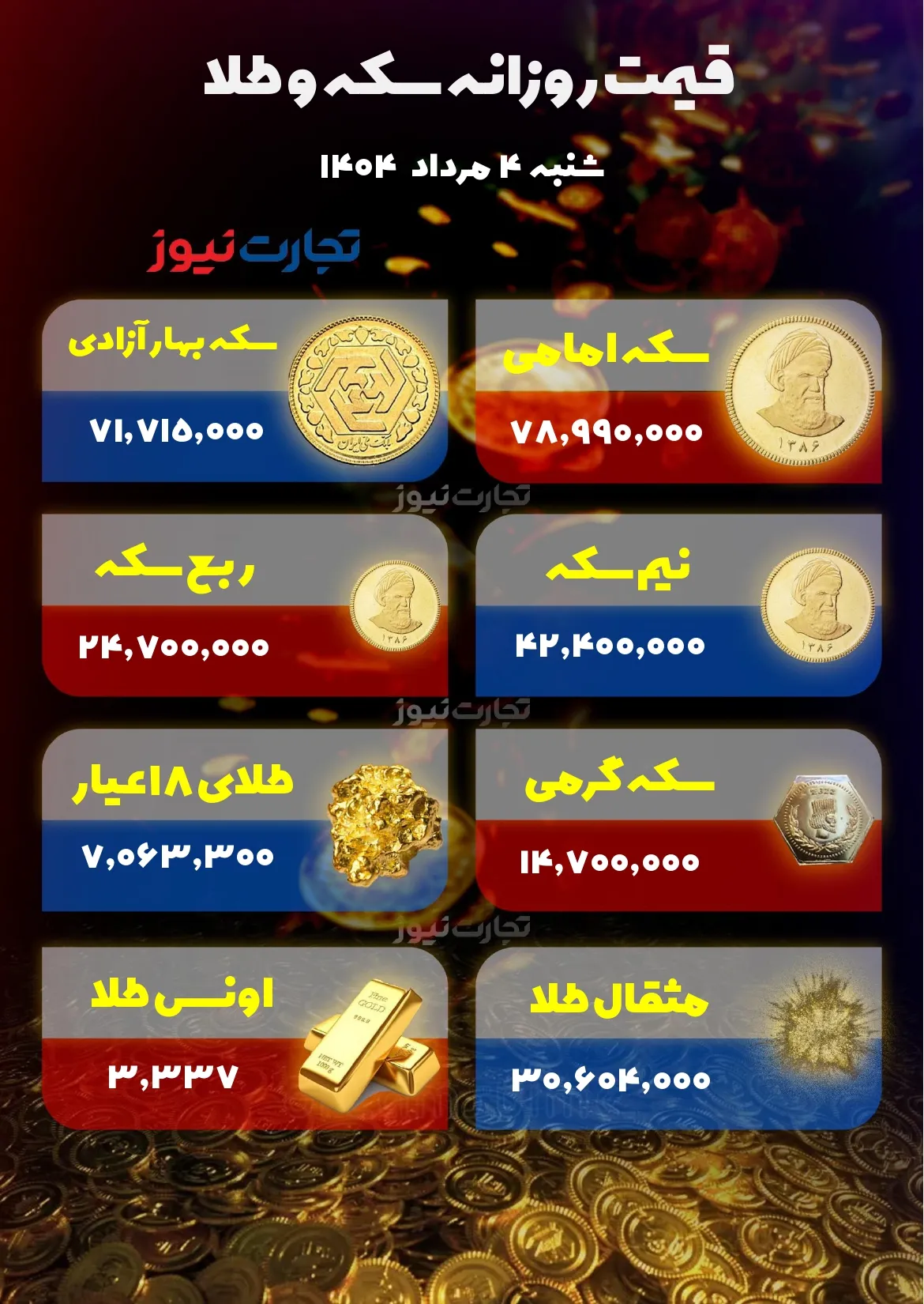 قیمت طلا و سکه امروز شنبه ۴ مرداد ۱۴۰۴ / بازار طلا نزولی شد