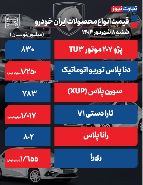 طبق اخبار تجاری ، قیمت محصولات ایرانی امروز ۸ است شهریور ۱۴۰۴ اعلام شد که بازار خودرو به دلیل نوسانات نرخ ارز ، تغییرات قابل توجهی در قیمت را ثبت کرده است. از یک سو ، افزایش خطرات سیاسی و از طرف دیگر کاهش پیشنهاد خودرو ، افزایش قیمت انواع اتومبیل های مسافری را به ثبت رسانده است.