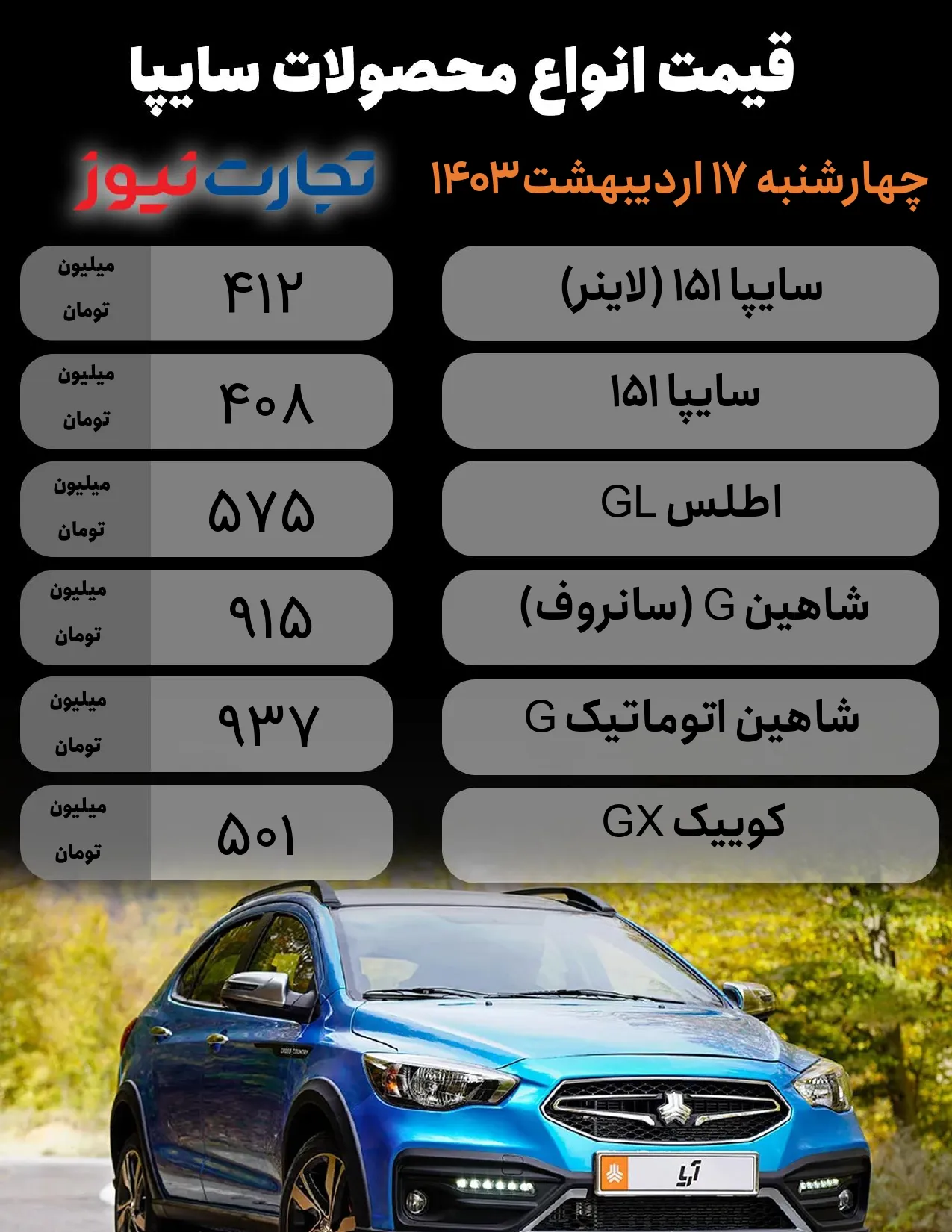 قیمت محصولات سایپا امروز 17 اردیبهشت 1404 + جدول – افق میهن
