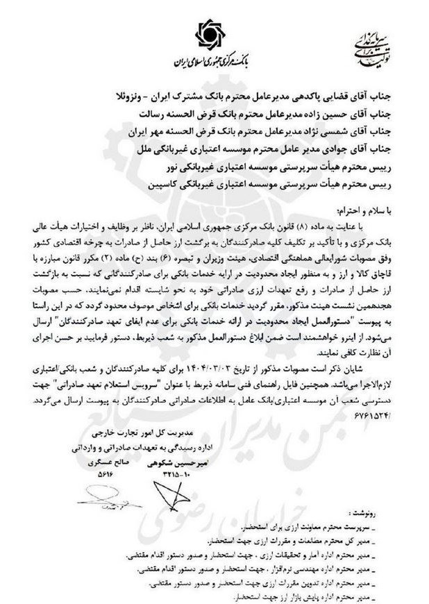 در بخشنامه امضا شده توسط صالح آسری ، مدیر کل خدمات مخفی بین المللی و روابط اقتصادی بانک مرکزی ، بیان می کند که کلیه بانک ها و موسسات مالی مطابق بند ۱ قانون بانک مرکزی و مطابق با مصوبات کابینه و کمیته اقدامات ارز مشمول موسسات مالی هستند.