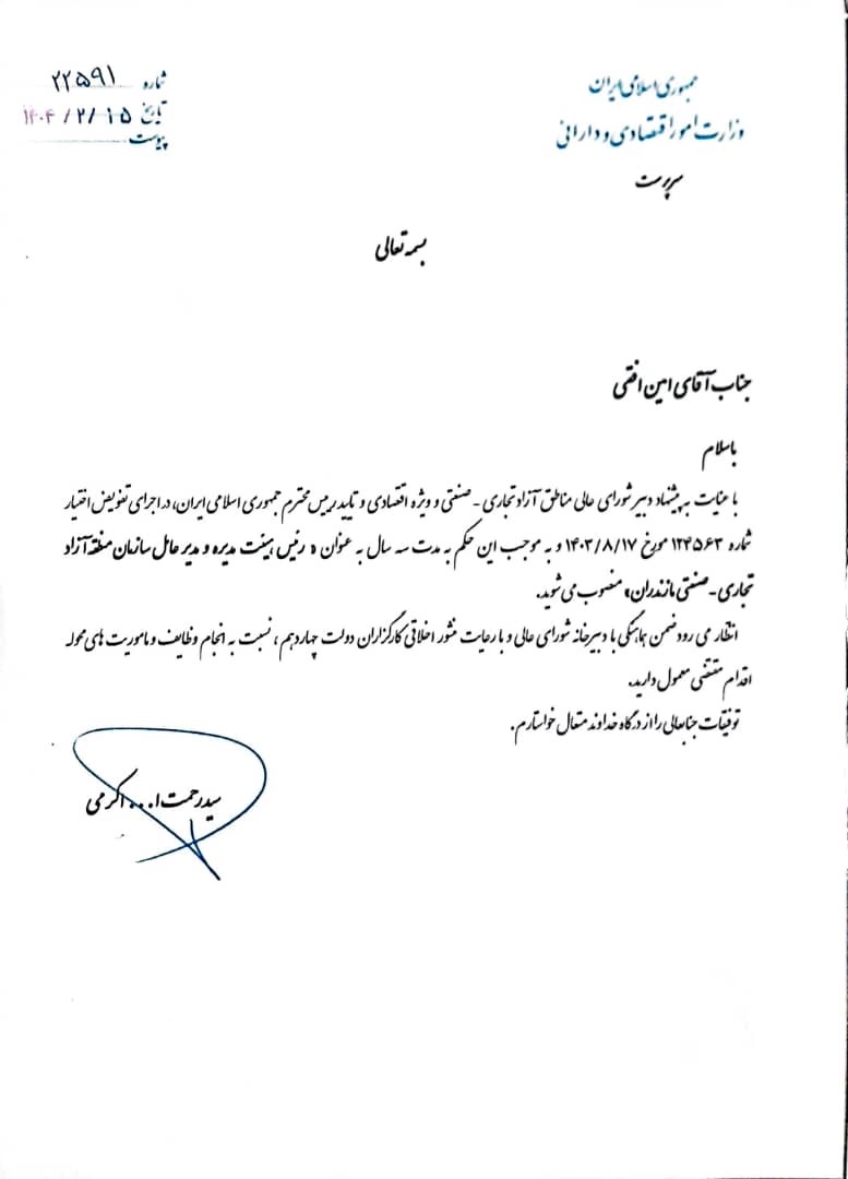براساس بانک اطلاعاتی اطلاعات Diarmirza ، دبیر شورای عالی مناطق اقتصادی آزاد و ویژه و به دستور سید رحمات الله آکرامی ، رئیس وزارت امور اقتصادی و دارایی. امین هوریزون به عنوان رئیس هیئت مدیره و مدیر عامل سازمان منطقه تجارت آزاد تجارت مازندران منصوب شد.