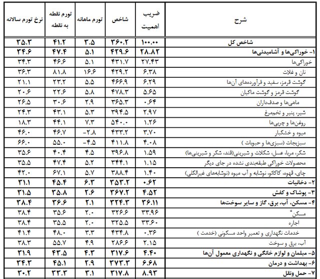 به گفته ناجواخ ، دفتر سرشماری ایران از شاخص قیمت کالاها و خدمات مصرفی خانواده ها در بخش های اصلی و برخی گروه ها و کلاس های کالا در ژوئیه سال جاری خبر داد که براساس آن میزان تورم مواد غذایی و نوشیدنی ها به طور کلی به ۴.۹ ٪ رسیده است.