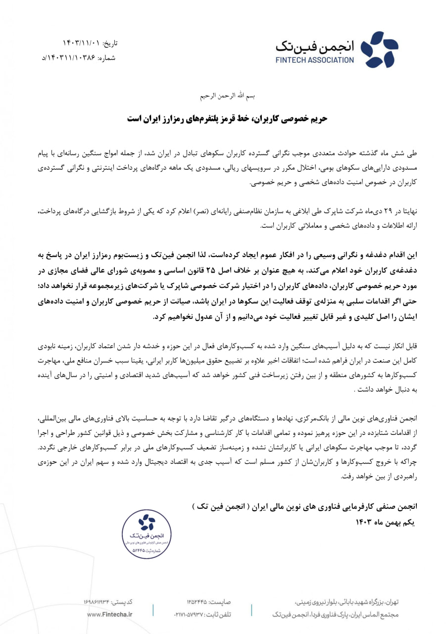حال در پاسخ به این درخواست عجیب، اکوسیستم فین تک و ارزهای دیجیتال ایران اعلام کرد: به هیچ وجه برخلاف اصل ۲۵ قانون اساسی و مصوبه شورای عالی فضای مجازی مبنی بر حفظ حریم خصوصی کاربران، دادههای کاربران در سایت قرار نخواهد گرفت. مالکیت شرکت خصوصی شاپرک یا شرکت های تابعه آن. قرار نخواهد داد؛ حتی اگر اقدامات منفی به معنای تعلیق فعالیت این پلتفرم ها در ایران باشد، ما حفظ حریم خصوصی کاربران و امنیت داده های آنها را اصل کلیدی و تغییرناپذیر فعالیت خود می دانیم و از آن عدول نخواهیم کرد.