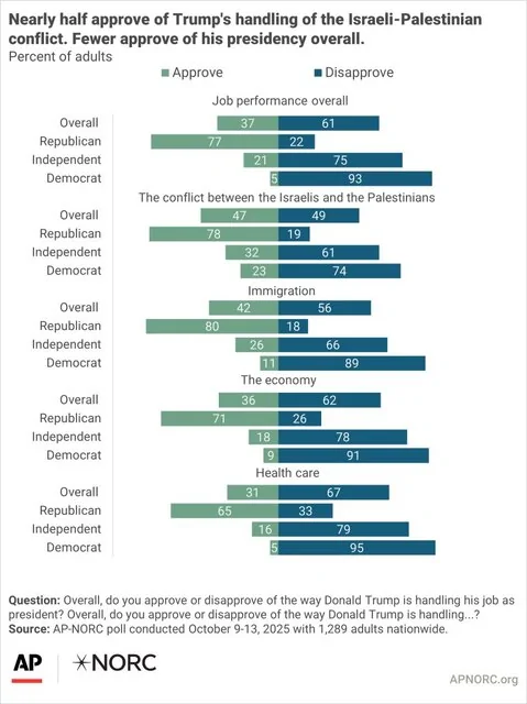به گزارش افق میهن، آرون بلیک، خبرنگار سی ان ان با انتشار تصویری از نتیجه نظرسنجی موسسه تحقیقاتی نورک و آسوشیتدپرس درباره مدیریت دونالد ترامپ، رئیس جمهور آمریکا در موضوع فلسطین نوشت: به نظر نمی رسد ترامپ به افزایش قابل توجهی در محبوبیت کلی خود در رابطه با توافق آتش بس غزه دست یافته باشد.