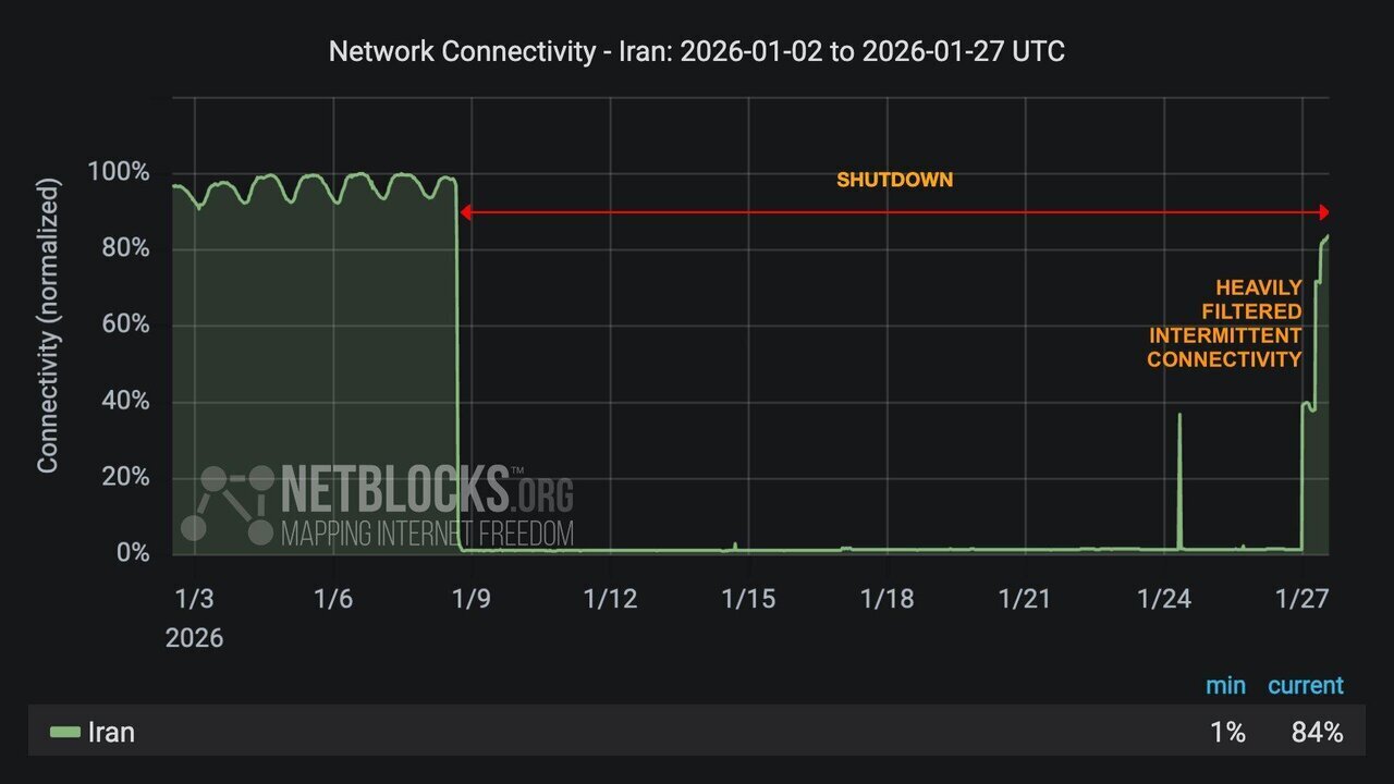 نمودار منتشر شده نشان می دهد که نرخ اتصال به اینترنت در ایران پس از کاهش نزدیک به صفر در هفته های گذشته، اکنون به حدود ۸۰ درصد رسیده است.