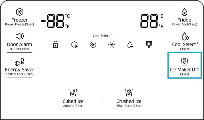 وقتی یخ ساز خاموش است، عملکرد یخ سازی غیرفعال می شود و حتی اگر دکمه های Cubed Ice یا Crushed Ice را روی پانل یخ ساز فشار دهید، یخ نخواهید داشت. برای فعال کردن عملکرد یخ سازی، باید یخ ساز را روشن کنید.