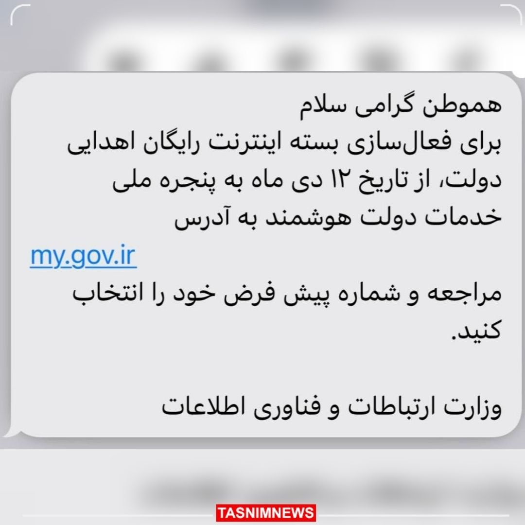 اکنون پس از موافقت با افزایش ۳۴ درصدی تعرفه اینترنت، پیامکی با محتوای بسته اینترنت اهدایی دولت از ساعت ۲۱ برای مردم ارسال شده است. دی ماه اعمال می شود.