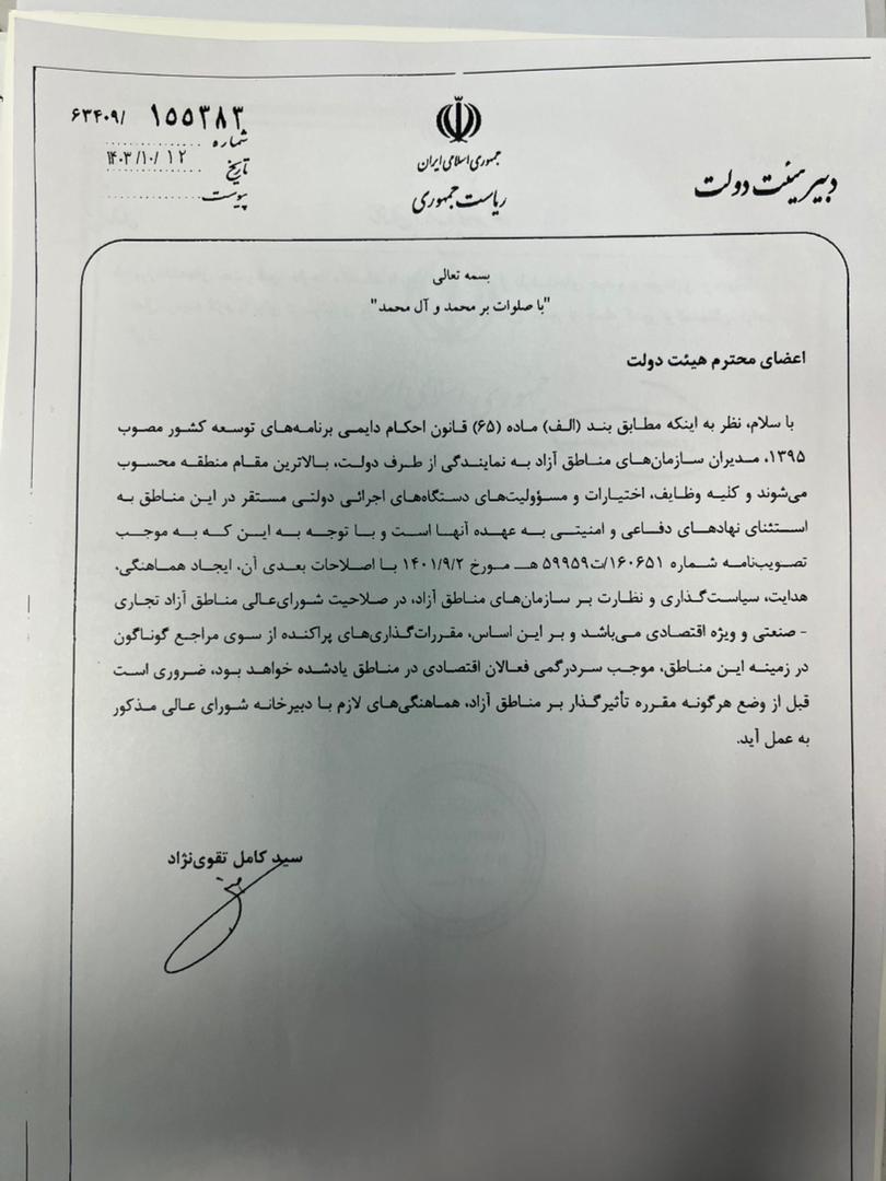 هرگونه بخشنامه دستگاههای اجرایی در ارتباط با مناطق آزاد منوط به هماهنگی با دبیرخانه شورای عالی شد