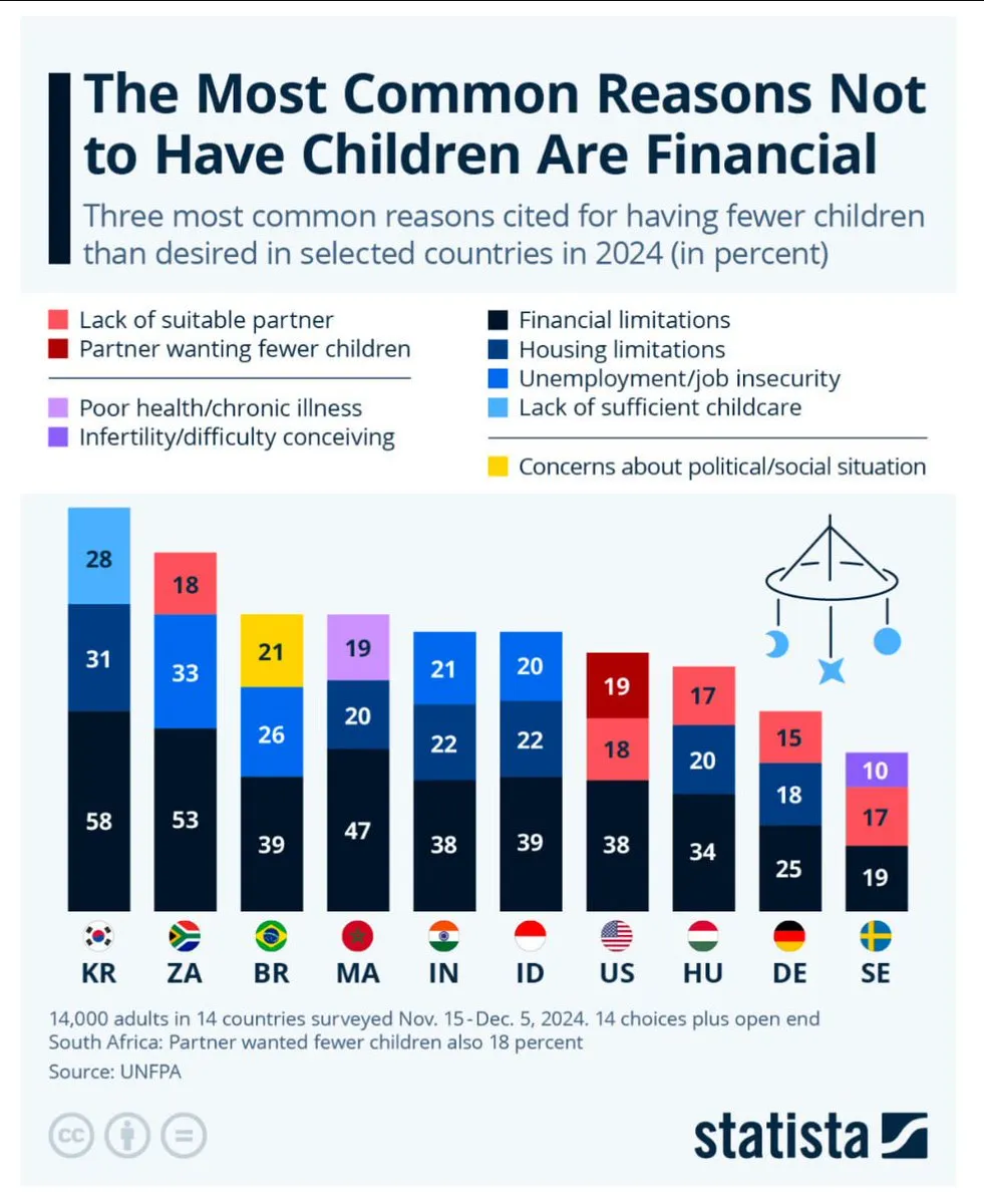 تجارت جدید توسط صندوق جمعیت سازمان ملل متحد (UNFPA) عدم اطمینان اقتصادی را به عنوان عامل اصلی کاهش نرخ باروری در سراسر جهان مشخص می کند. نگرانی های مالی ، از جمله بی ثباتی مشاغل ، هزینه های مسکن و افزایش هزینه های مراقبت از کودکان ، شایع ترین دلایلی است که مردم تمایل به داشتن کمتر یا کمبود فرزندان دارند. در این مطالعه ۶۰۰۰ زن و مرد در ۹ کشور بررسی شده است ، با حدود ۲ درصد از جمعیت جهان و نتایج آنها در گزارش وضعیت جمعیت جهان در سال ۲۰۲۵ مطابقت دارد.