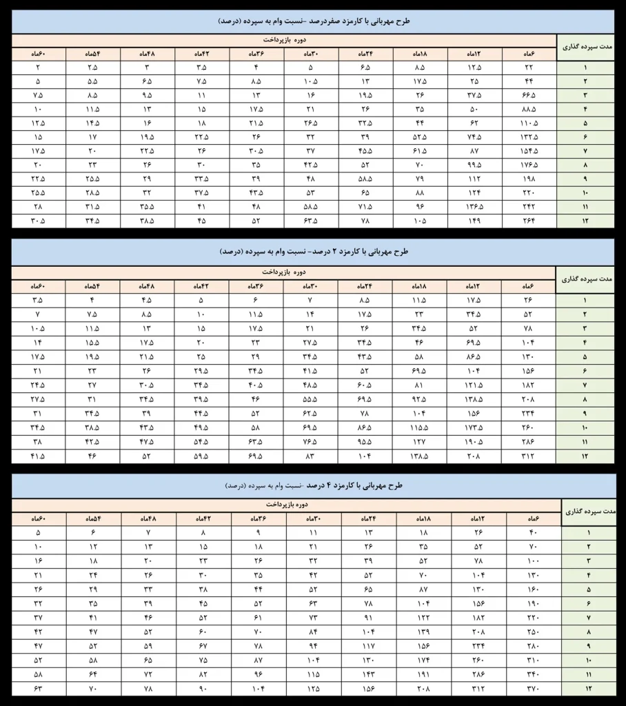 جداول زیر نسبت وام ها را به -deposite در برنامه دوستانه بانک ملی ، نرخ بهره ، دوره بازپرداخت و زمان سپرده نشان می دهد.