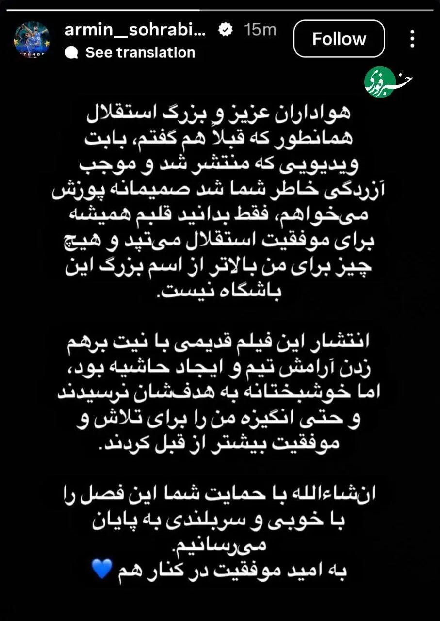 آرمین سهرابیان مدافع تیم ملی فوتبال ایران در واکنش به رسوایی های اخیر بار دیگر مطلبی را منتشر کرد.