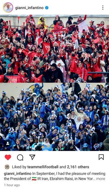 جیانی اینفانتینو نوشت: «در شهریور ماه، خوشحالم که در شهر نیویورک با ابراهیم رئیسی رئیس جمهوری ایران دیدار کردم و در آنجا در مورد توسعه فوتبال بانوان در کشور و پیشرفت های صورت گرفته در زمینه حضور بانوان در استادیوم های فوتبال گفتگو کردیم. از این رو با خوشحالی متوجه شدم حدود ۳۰۰۰ زن در دربی تهران بین پرسپولیس و استقلال حضور داشتند.