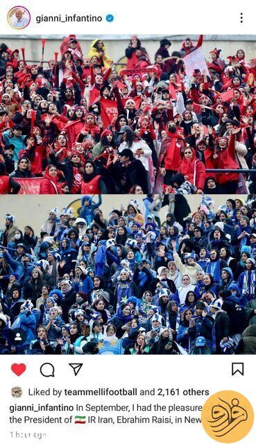 جانی اینفانتینو نوشت: «دکتر شهریور ماه، خوشحالم که در شهر نیویورک با ابراهیم رئیسی رئیس جمهوری ایران دیدار کردم و در آنجا در مورد توسعه فوتبال بانوان در کشور و پیشرفت های صورت گرفته در زمینه حضور بانوان در استادیوم های فوتبال گفتگو کردیم.