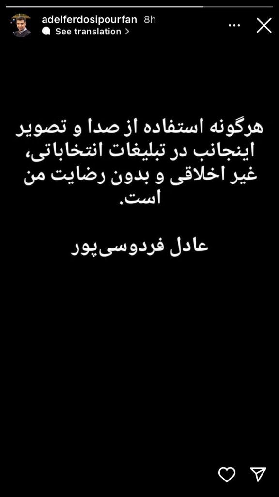 عادل فردوسی پور طی خبری هشدار داد که نامزدهای انتخاباتی مجاز به استفاده از صدا و تصویر او برای تبلیغات خود نیستند.