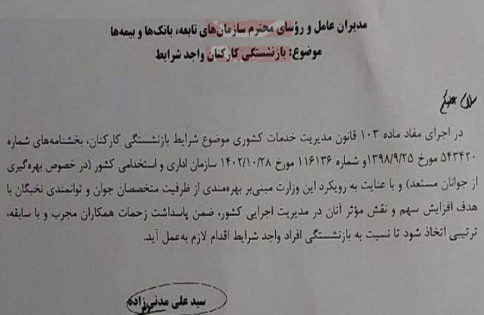 به گفته بازار ، وزیر اقتصاد علی مادانی زاده موضوع بازنشستگی کارمندان واجد شرایط را به مدیر عاملان و روسای شرکتها ، بانک ها و سازمان های بیمه ابلاغ کرده است.