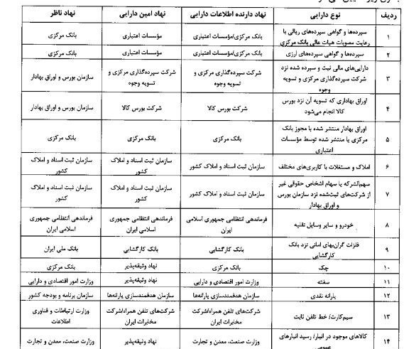 طبق دستورالعمل و مستند بانک مرکزی توسط قانون اجرایی کابینه ، دارایی های ارزشمند شامل انواع دارایی های فیزیکی ، مالی ، اعتباری و دیجیتال است که مهمترین آنها به شرح زیر است: