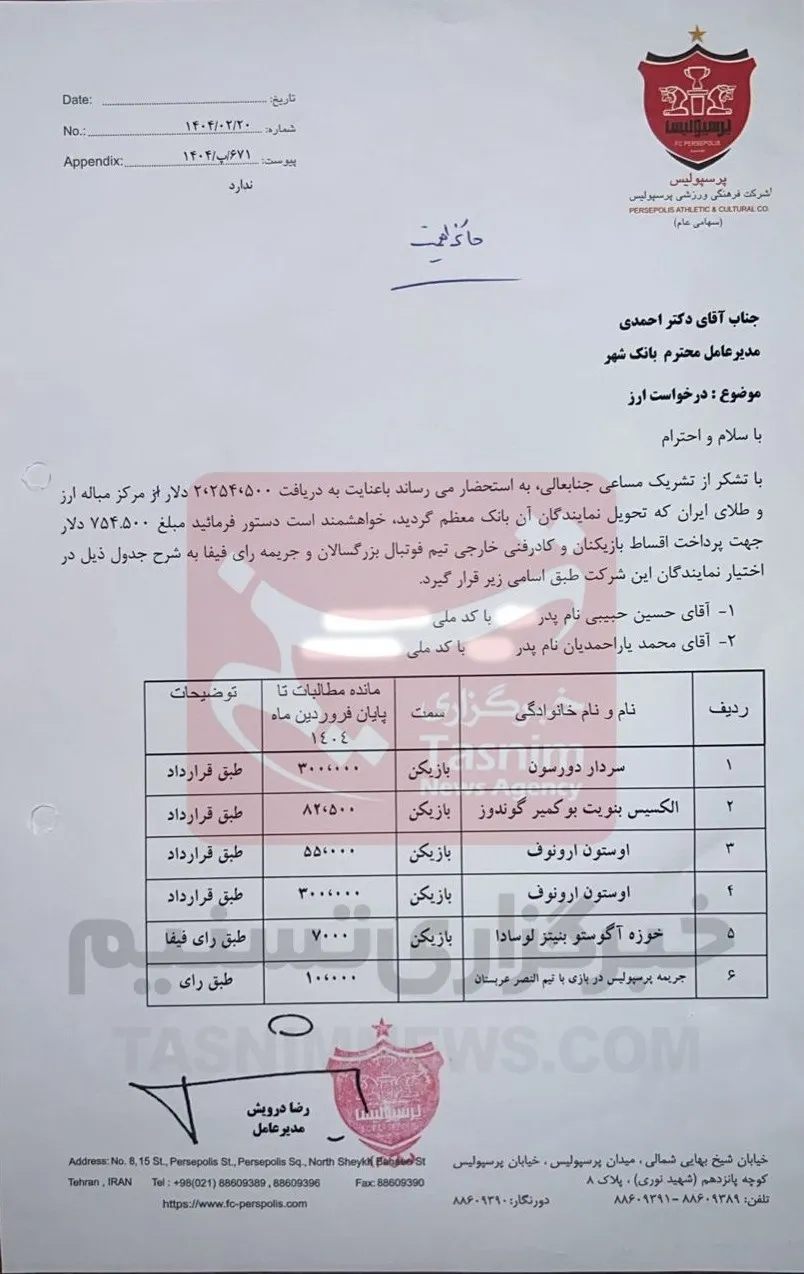 پرداخت میلیاردی به خارجیهای پرسپولیس وجریمه ۱۰هزاردلاری+سند – افق میهن