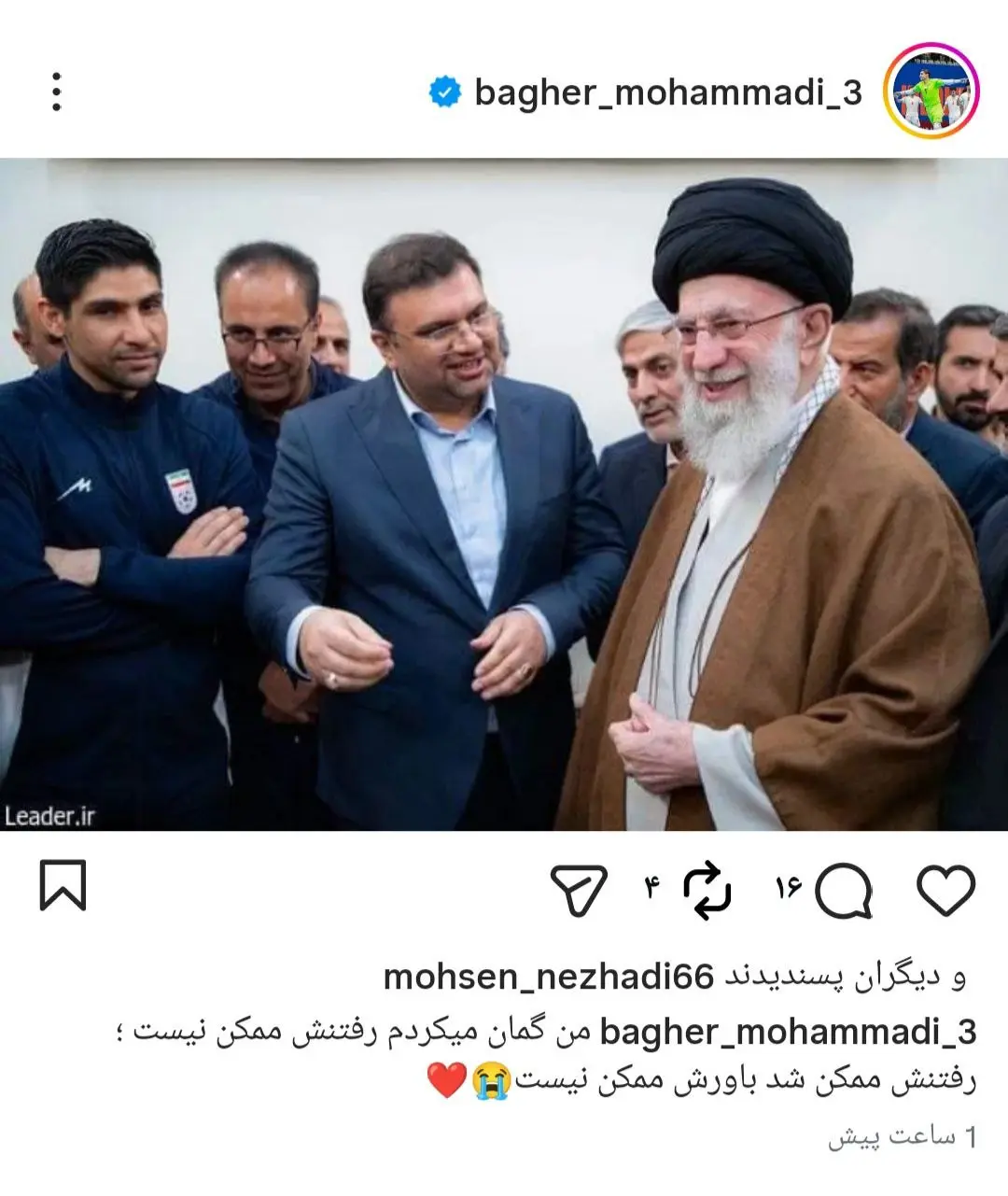 وی با انتشار تصویری از شهید رهبر انقلاب در دیدار خصوصی با فوتسالیست ها نوشت: فکر می کردم رفتنش مقدور نیست. نمی توان باور کرد که امکان رفتن او وجود داشت.