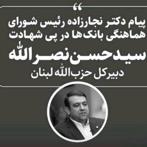 اینجانب به نمایندگی از همکاران عزیز نظام بانکی کشور این ضایعه را به محضر رهبر معظم انقلاب اسلامی و رزمندگان جبهه مقاومت بویژه رزمندگان عزیز حزب الله لبنان تسلیت عرض نموده و از درگاه خداوند متعال علو درجات و انحطاط روزافزون را مسئلت دارم. رژیم غاصب اسرائیل