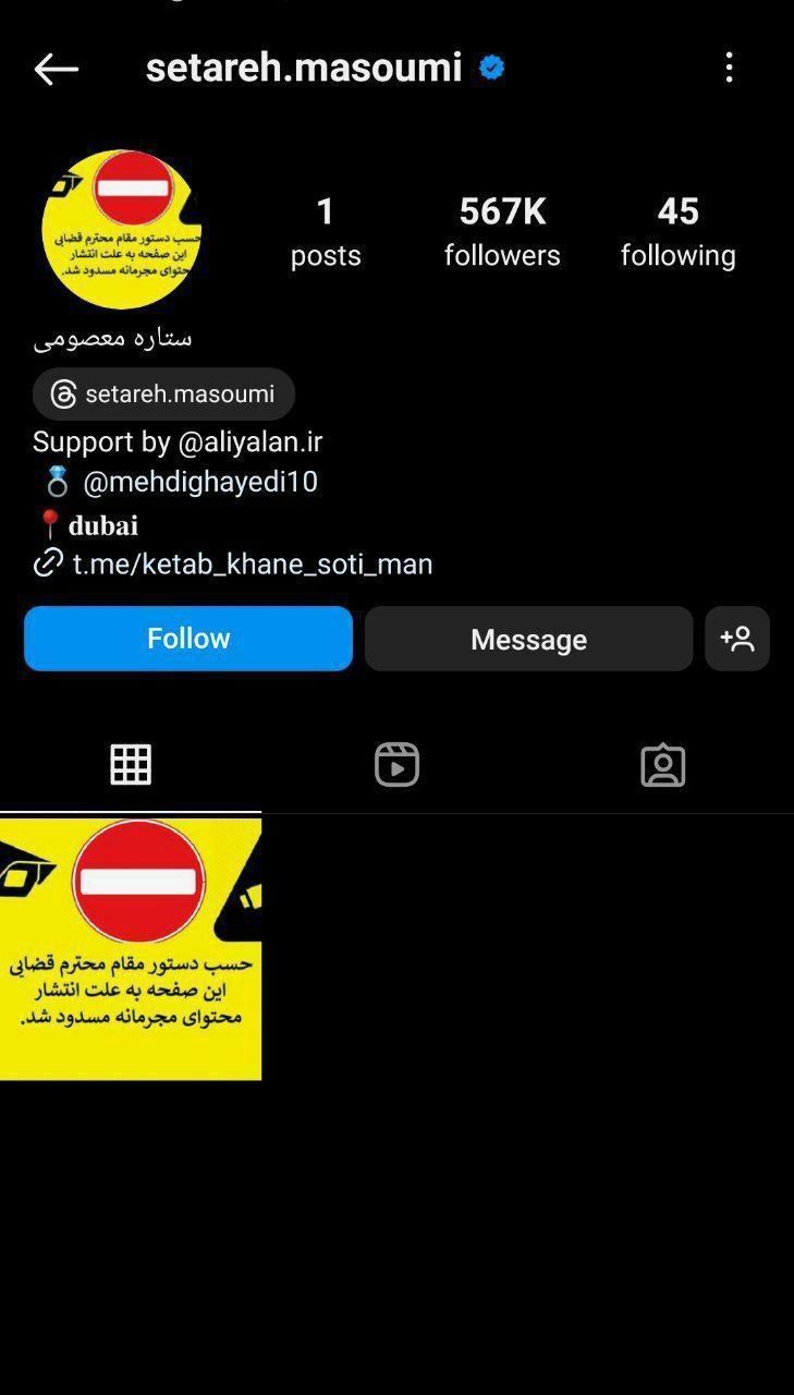 بنا به دستور مقامات قضایی صفحه اینستاگرام همسر مهدی قیدی از دسترس خارج شد. دلیل این اقدام مشخص نیست اما پس از حذف تمامی پست های صفحه شخصی ستاره معصومی، پستی با این محتوا توسط پلیس فتا به اشتراک گذاشته شد.