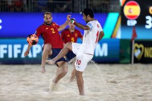 تیم ملی فوتبال ساحلی در نیمه اول این بازی با نتیجه ۳-۱ شکست خورد و دو تیم در نیمه دوم ۲ گل به ثمر رساندند تا بازی ۵-۳ شود. در تایم سوم این دیدار با وجود حملات و دوبار لرزش ایران تیر دروازه اسپانیا در فاصله ۵ دقیقه مانده به پایان بازی موفق شد دو گل به ثمر برساند تا کار به وقت اضافه کشیده شود. در وقت اضافه هر تیم یک گل زد تا به ضربات پنالتی برود.