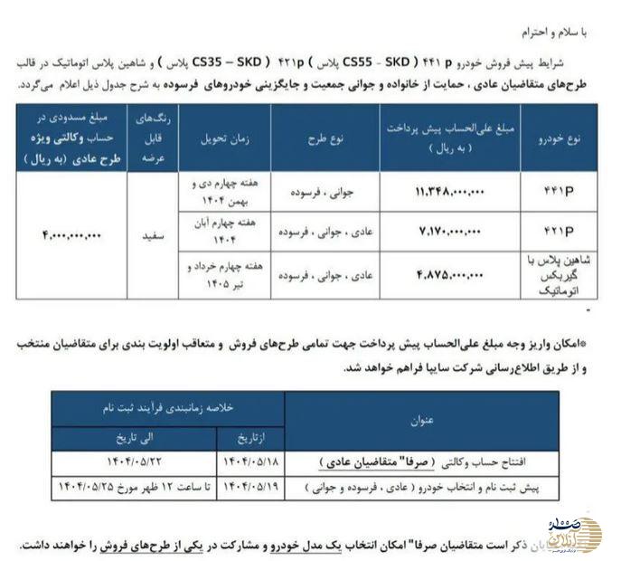 شرکت سایپا در جدیدترین اعلامیه خود ، جزئیات CS55 ، Changan CS35 و Shahin Plus جزئیات اتومبیل های اتوماتیک منتشر شده پیش فروش شامل برنامه هایی برای متقاضیان عادی ، پشتیبانی خانواده و جوانان و همچنین جایگزینی اتومبیل های فرسوده است. در اینجا تمام اصطلاحات ، جزئیات ثبت نام و مزایای هر پروژه آورده شده است.