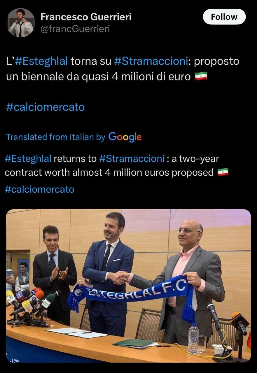 Francesco Gueri ، خبرنگار Calcho Mercato ، در شبکه X توئیت کرد که این باشگاه ۵ میلیون یورو دو ساله را به Stramachoni ارسال کرده است و در تلاش است تا او را متقاعد کند که به ایران برود.
