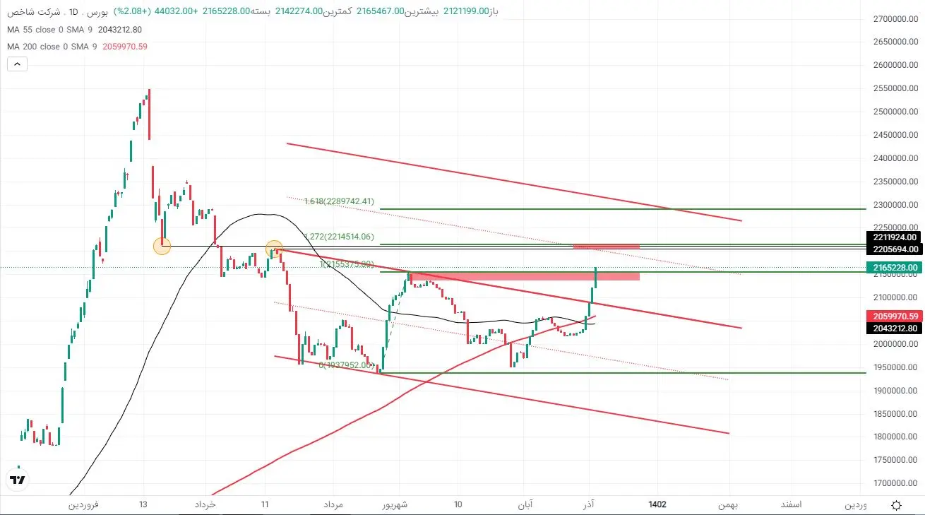 رشد بیش از ۱۳۳ هزار واحدی شاخص طی چهار روز معاملاتی گذشته، محدوده عرضه بالای ۲ میلیون و ۱۴۲ تا ۲ میلیون و ۱۵۵ هزار واحدی را شکست. با توجه به فراتر رفتن شاخص کل از سقف قبلی تعیین شده در ۱۴ شهریور، روند صعودی شاخص با تشکیل حدهای بالا و پایین بالاتر در تصویر فنی نیز قابل مشاهده است. از سوی دیگر شمع های این چهار روز معاملاتی در سایز بزرگ تری ثبت شدند. یعنی حرکت بازار صعودی است که با شکل گیری روند پولی خارج از بازار شروع شد.