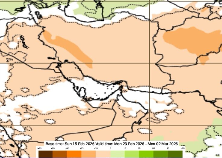 نقشه زیر پیش بینی میانگین ناهنجاری بارندگی برای روزهای یازدهم تا هجدهم را نشان می دهد. اسفند بر اساس نقشه پیش بینی می شود بارندگی در اکثر نقاط کشور کمتر از حد نرمال باشد.