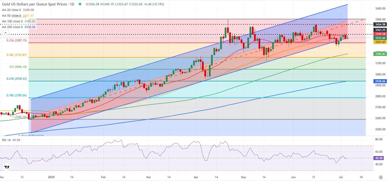 قیمت طلا بخش قابل توجهی از آخرین رشد خود را از دست داده است زیرا انتظارات بازار در ماه ژوئیه کاهش یافته است تا نرخ بهره ایالات متحده را کاهش دهد. در حالی که بازارها مشتاقانه منتظر انتشار نتایج مذاکرات تجاری جدید و تحولات ژئوپلیتیکی هستند ، طلا در منطقه فعلی ادغام شد.
