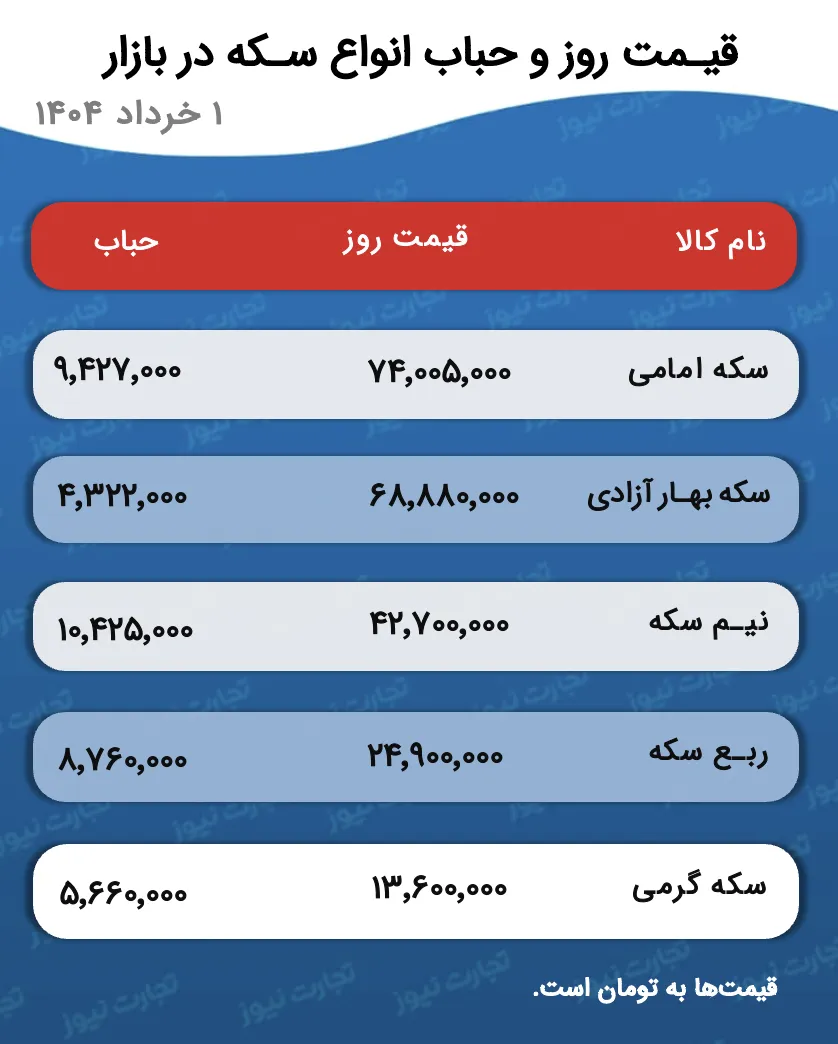 قیمت سکه امامی پنجشنبه ، خرداد با رشد ۴۰۰۰ تومن ، تعداد ۵ میلیون پنج هزار تومانس بود. قیمت سکه بهاری آزاد با ۲ میلیون و ۶۰۰۰ تومان معامله شد.